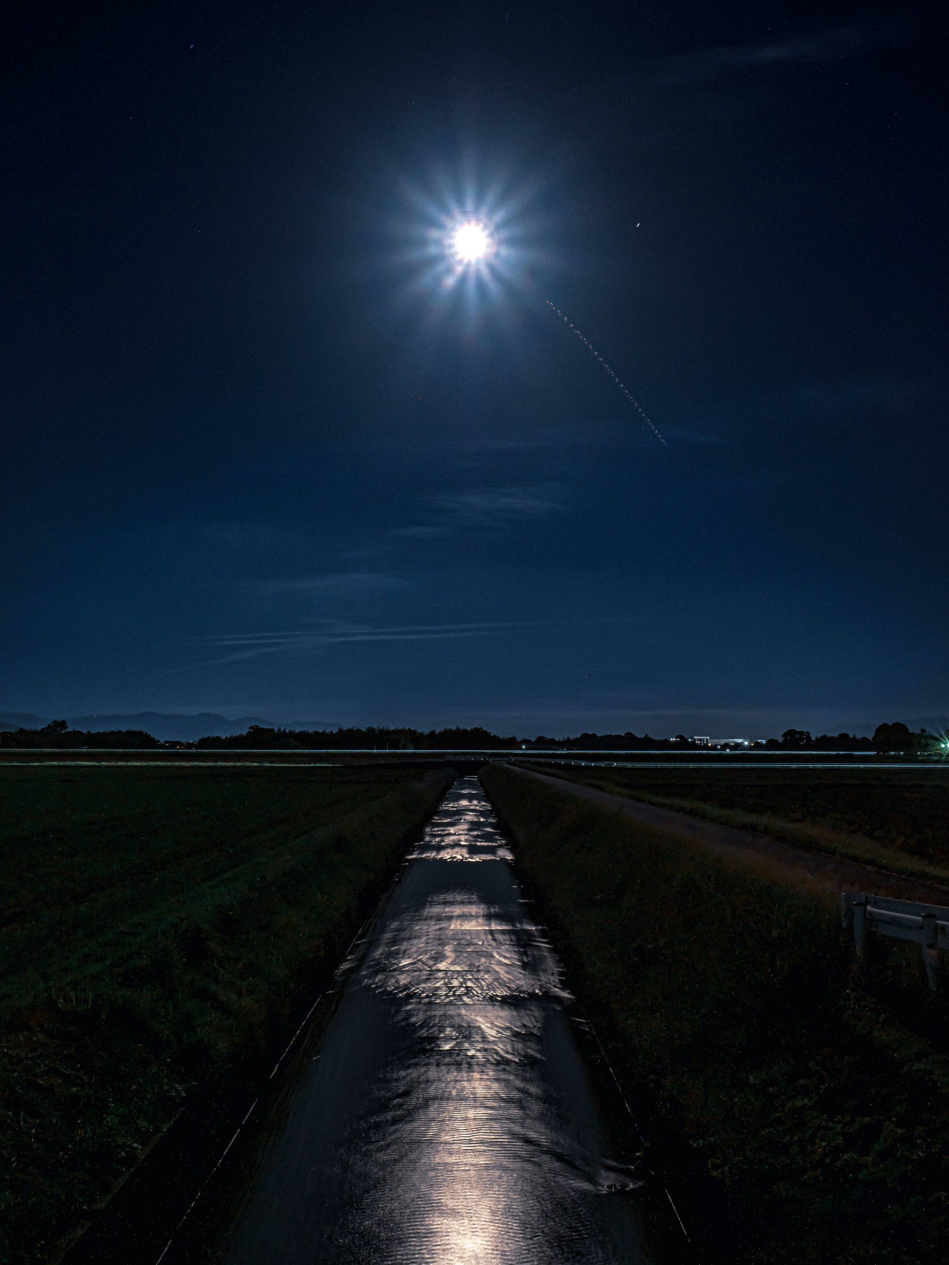 月と小川の流れる方向がピタリと一致して凜と輝く月につながりそうな「月の道」が川面に光っているのを見事にとらえています。