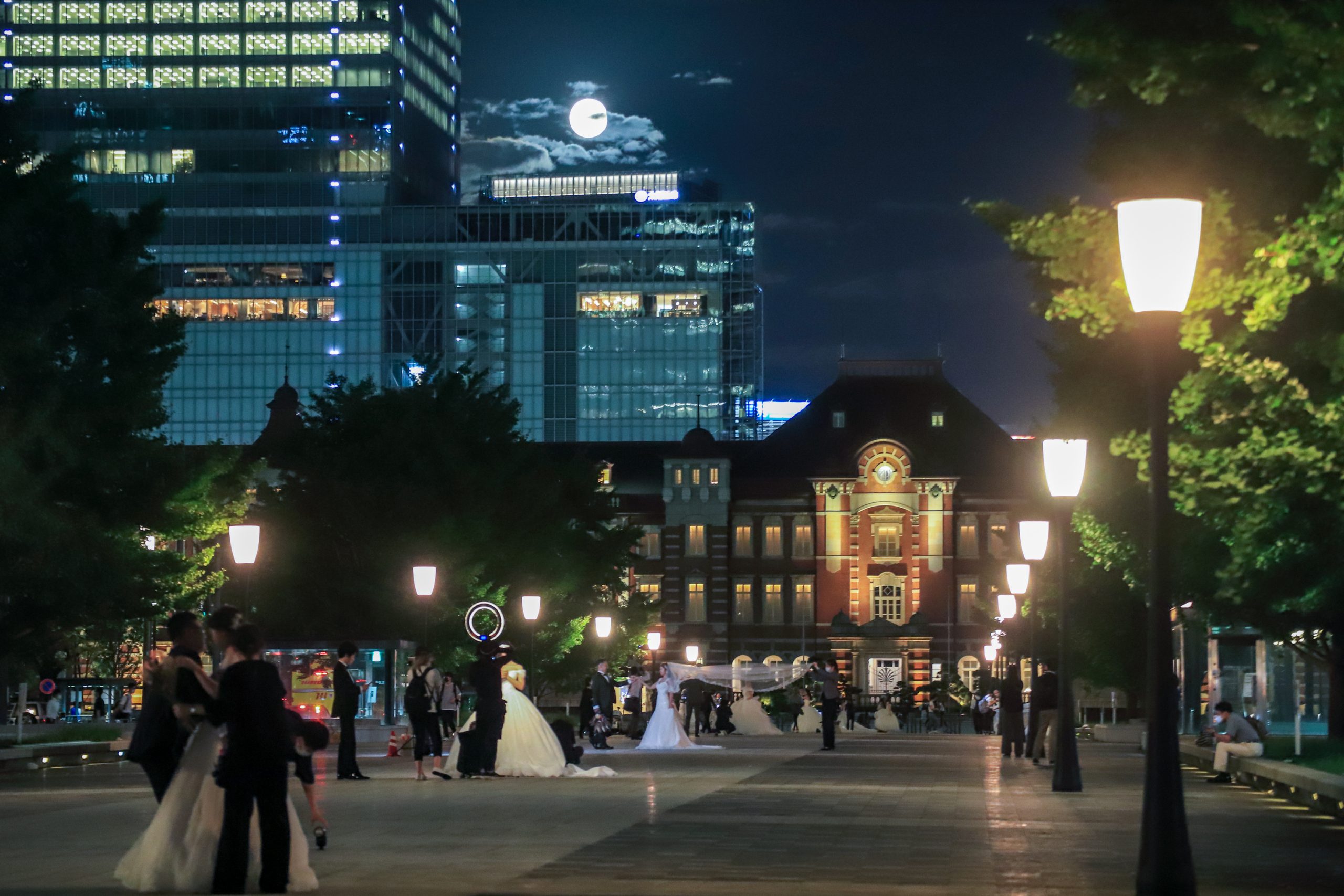東京駅前で前撮りの人々と満月が呼応する都市の光景、