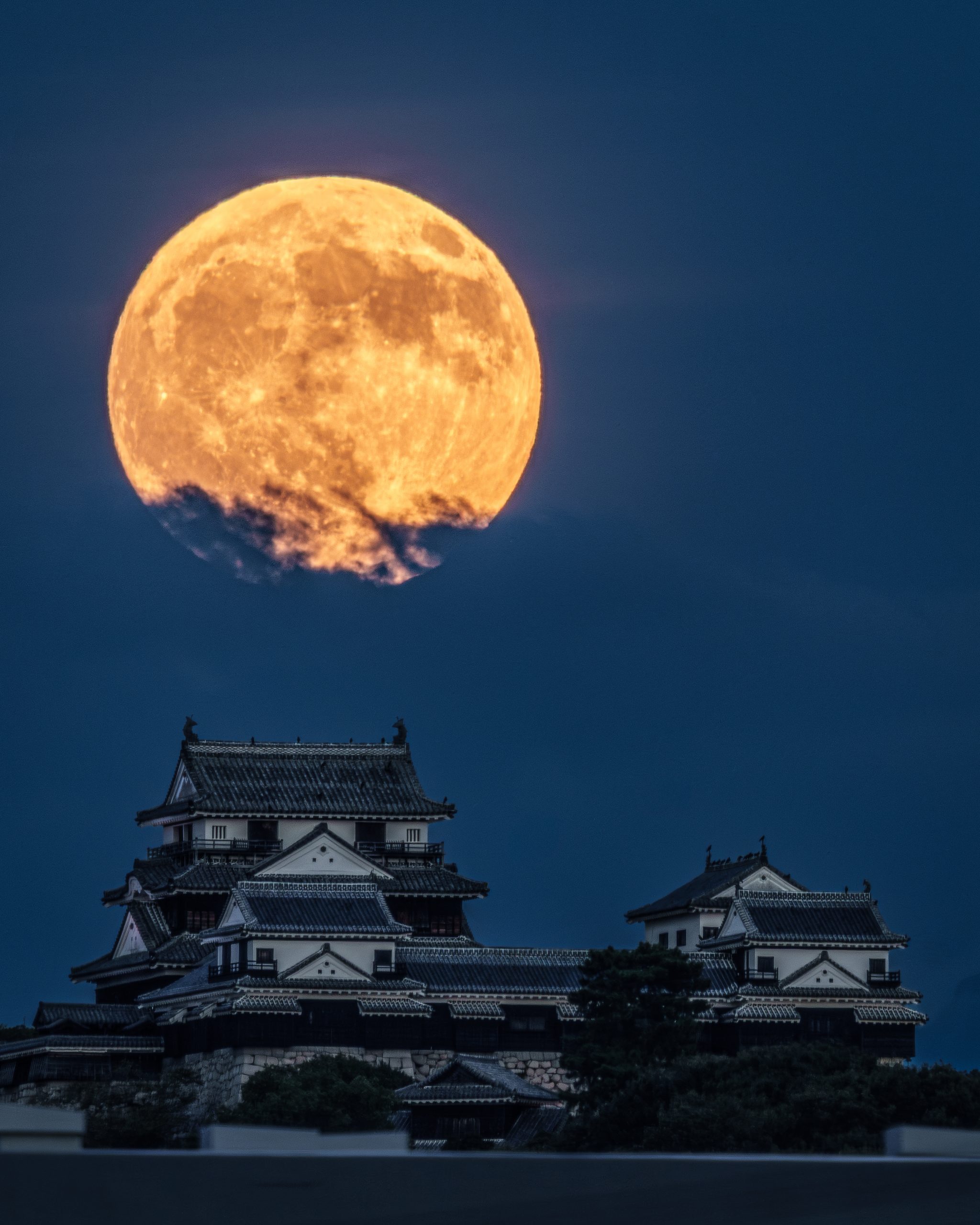 松山城天守に寄り添う巨大な満月を精密に捉えた望遠の妙技、