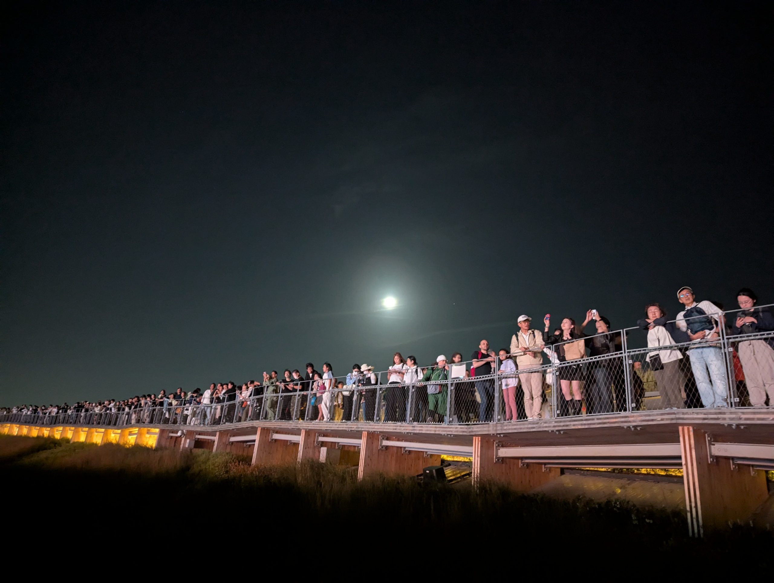 満月に薄雲がかかって情緒があり、カメラマンのリングライトが月と呼応して見えるのも面白いですね。