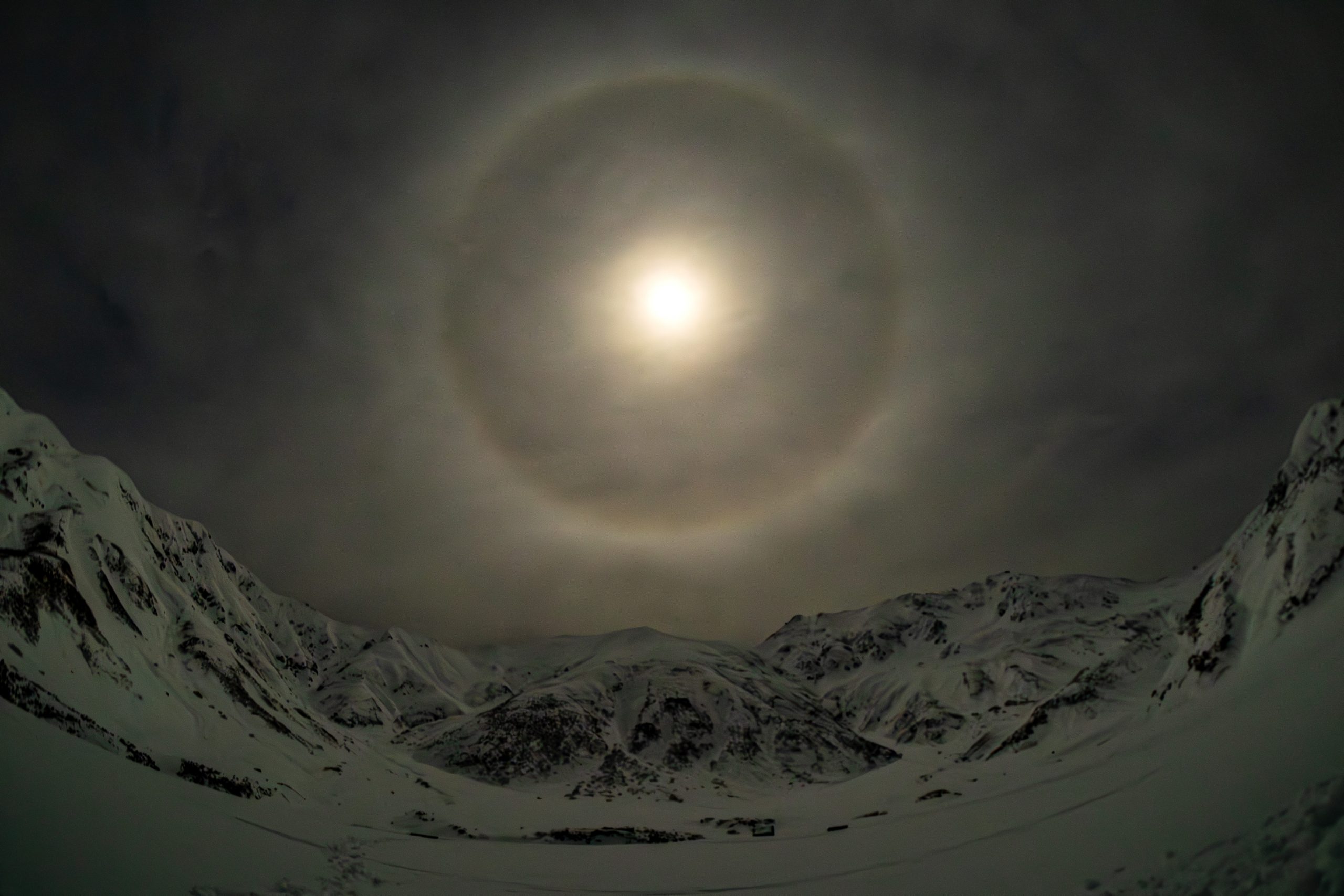 雪の立山の深い夜空に浮かんだ完璧な月暈、